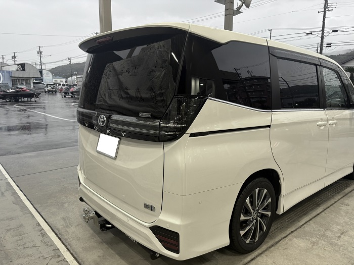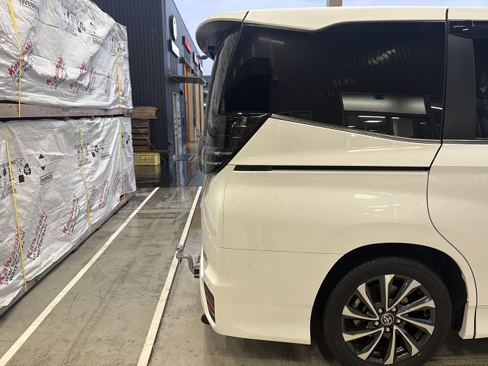 トヨタ VOXY(6AA-ZWR90W)へのソレックス製ヒッチメンバー取付けには、右側に2ヶ所、左側に3ヶ所の穴あけ加工が必要となります。